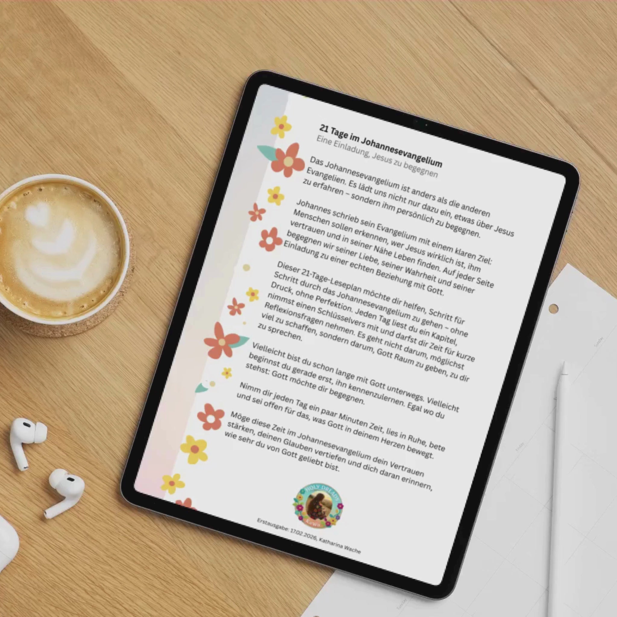 Dieser liebevoll gestaltete Leseplan begleitet dich 21 Tage lang durch das Johannesevangelium. Jeden Tag liest du ein Kapitel, entdeckst einen Schlüsselvers und bekommst zwei Reflexionsfragen, die dir helfen, Gottes Wort persönlich zu vertiefen.